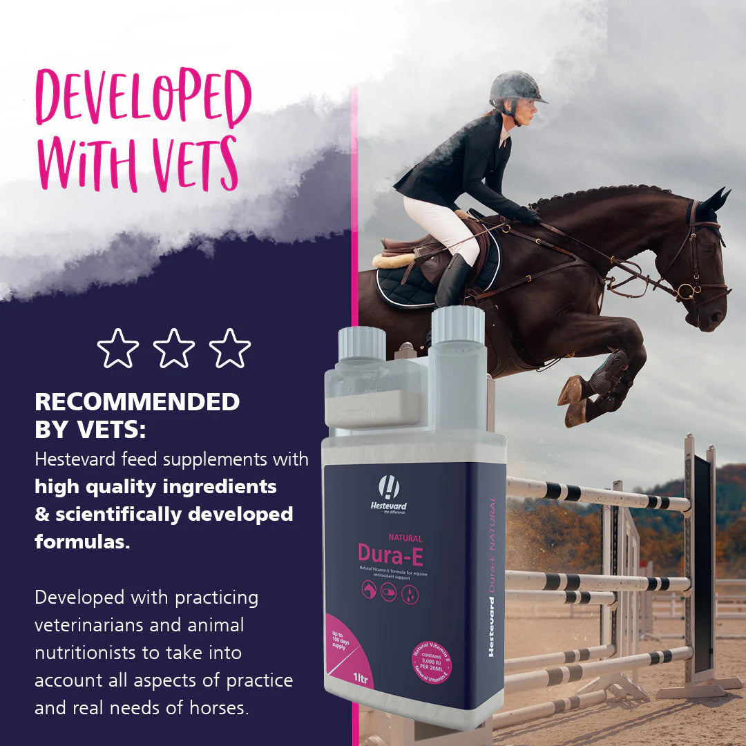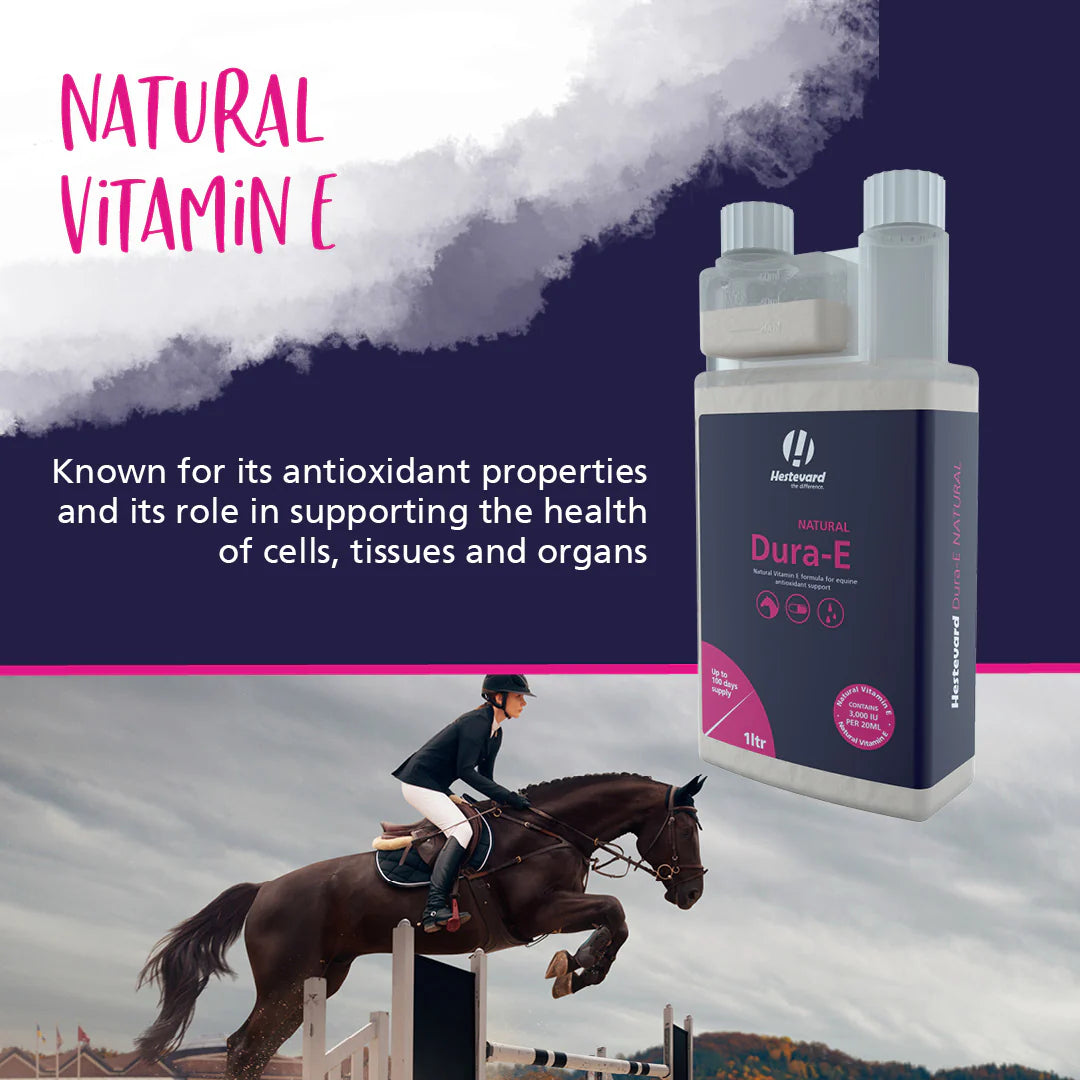 Hestevard Dura-E ir augstas kvalitātes E vitamīna šķidrais uztura bagātinātājs, kas īpaši izstrādāts, lai atbalstītu zirgu muskuļu darbību, nervu sistēmu un imūnspēju. Tā sastāvā esošais E vitamīns ir spēcīgs antioksidants, kas palīdz aizsargāt organisma šūnas no oksidatīviem bojājumiem – īpaši būtiski sporta un darba zirgiem ar augstu fizisko slodzi.