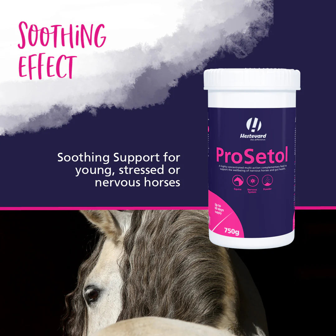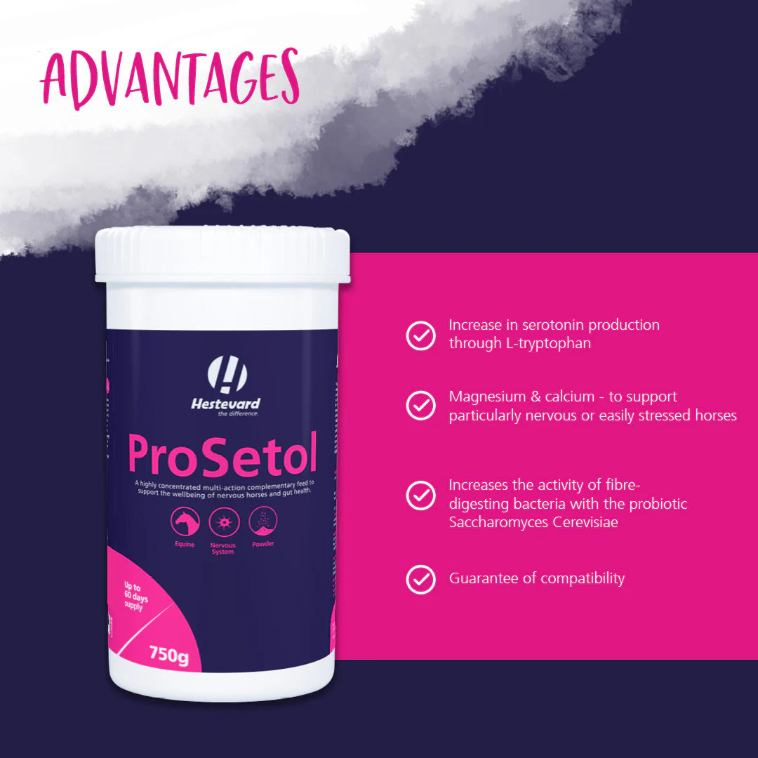 ProSetol ir augsti koncentrēta papildbarība, kas paredzēta nervozu zirgu labsajūtas un zarnu veselības uzlabošanai. Šis uztura bagātinātājs ir ideāli piemērots zirgiem, kuriem ir stress vai uztraukumi, un palīdz nodrošināt mieru un līdzsvaru.