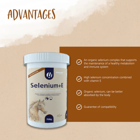 SELENIUM-E ir papildbarība, kas apvieno augstu selēna koncentrāciju un E vitamīnu, palīdzot uzturēt veselīgu vielmaiņu un stiprinot imūnsistēmu. Šis produkts ir īpaši piemērots zirgiem, kuriem uztura speciālists vai veterinārārsts ir konstatējis selēna deficītu.